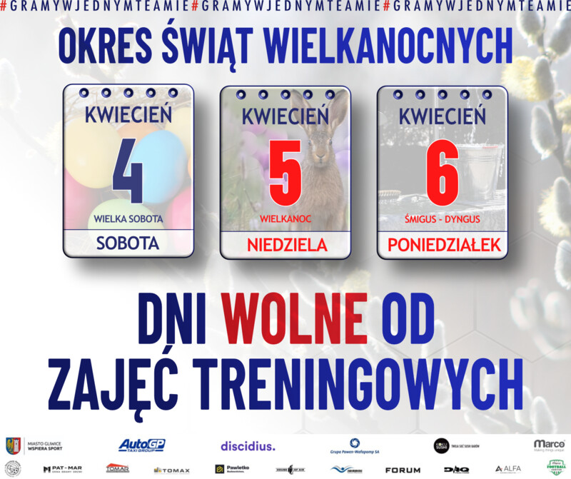 Przypominamy, że zajęcia piłki nożnej w Wielką Sobotę (04.04), Niedzielę Wielkanocną (05.04) oraz Poniedziałek Wielkanocny (06.04) nie odbędą się.